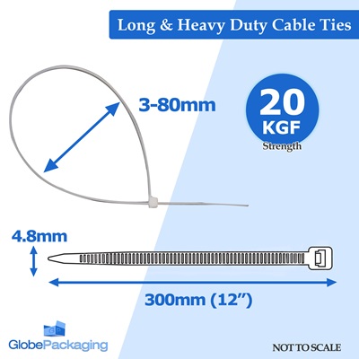 1000 (10 x packs of 100) natural (clear) cable ties size 300mm x 4.8mm, also known as zip ties. These are high tensile premium strength cable ties with a brake strain of 20kg, and are made from high-grade nylon plastic rates for extreme temperatures ranging from -40 degrees Celsius to +85 degrees Celsius. They are suitable for a wide range of applications including the following: