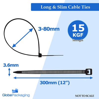2000 (20 x packs of 100) black cable ties size 300mm x 3.6mm, also known as zip ties. These are high tensile premium strength cable ties with a brake strain of 15kg, and are made from high-grade nylon plastic rates for extreme temperatures ranging from -40 degrees Celsius to +85 degrees Celsius. They are suitable for a wide range of applications including the following: